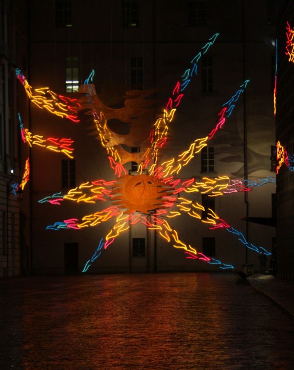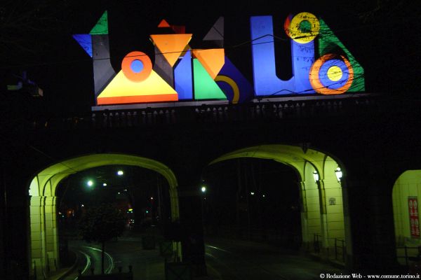 ‘Cosmometrie’ di Mario Airò in piazza Carignano, schemi simbolici e geometrici proiettati sulla pavimentazione urbana; ‘Tappeto Volante’ di Daniel Buren in piazza Palazzo di Città, centinaia di cavi d’acciaio paralleli reggono una ‘scacchiera’ di lanterne cubiche basata su colori primari, il bianco il rosso e il blu (gli stessi della bandiera francese); ‘Volo su…’ di Francesco Casorati in via Garibaldi, un filo rosso in flex-neon sostenuto da sagome geometriche di uccelli fiabeschi; ‘Regno dei fiori: nido cosmico di tutte le anime’ di Nicola De Maria in piazza San Carlo, lampioni tramutati in fiori luminosi; ‘Il Giardino Barocco Verticale’ di Richi Ferrero in via Alfieri 6 (Palazzo Valperga Galleani), leggere emissioni luminose che restituiscono alla memoria il segno caratteristico delle aree comuni di un giardino ormai scomparso; ‘L’energia che unisce si espande nel blu’ di Marco Gastini nella Galleria Umberto I (opera permanente), un intrigo di simboli e segni grafici di colore blu e rosso che si incontrano sul soffitto della galleria; ‘Planetario’ di Carmelo Giammello in via Roma, costellazioni disegnate da sottili tubi al neon che collegano globi di varie dimensioni e proporzioni; ‘Migrazione (Climate Change)’ di Piero Gilardi nella Galleria San Federico, 12 sagome di pellicani applicati a una rete sospesa verticalmente, che si illuminano e si spengono gradualmente, seguendo un algoritmo di controllo; ‘Cultura=Capitale’ di Alfredo Jaar in piazza Carlo Alberto (opera permanente), un’equazione luminosa cultura=capitale che è un invito a pensare alla creatività e al sapere condivisi da tutti i cittadini come al vero patrimonio di un Paese; ‘Luì e l’arte di andare nel bosco’ di Luigi Mainolfi in via Lagrange, la narrazione di una fiaba che si estende come una sequenza di frasi luminose ; ‘Il volo dei numeri’ di Mario Merz sulla Mole Antonelliana (opera permanente), sulla cupola il forte segnale luminoso è dato dal valore simbolico della sequenza della serie di Fibonacci dove ogni numero è la somma dei due precedenti; ‘Concerto di parole’ di Mario Molinari in viale dei Partigiani (Giardini Reali), gigantesche sculture astratte, realizzate in polistirolo espanso, verniciate a vivaci colori e illuminate da potenti fari; ‘Vento Solare’ di Luigi Nervo in piazzetta Mollino, una grande sagoma luminosa legata alla cosmologia fantastica e ‘Palomar’ di Giulio Paolini in via Po, un antico atlante astronomico costellato da pianeti inscritti in forme geometriche che culmina nella sagoma di un acrobata in equilibrio su un cerchio.