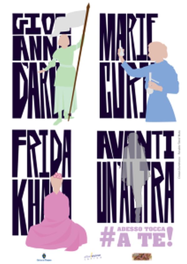 La prima locandina che verrà diffusa è stata realizzata dai due studenti che hanno vinto il concorso per una campagna di comunicazione e ha come oggetto la possibilità di scelta delle ragazze di poter diventare quello che possono sognare. Le tre figure, che invitano a fare un passo avanti, sono tre donne che hanno segnato la storia del loro tempo e ancora fanno parte della memoria collettiva. Giovanna d’Arco, guerriera e condottiera, Frida Kahlo, artista rivoluzionaria, Marie Curie, scienziata fisica e chimica, sono le donne scelte per ricordare a chiunque che le differenze di genere non possono e non devono essere un ostacolo per i percorsi lavorativi e di vita.