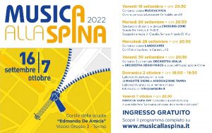 Musica alla Spina presenta dal 16 settembre al 7 ottobre presenta un cartellone di concerti , spettacoli teatrali e danza. Una giornata, domenica 2 ottobre dalle 16 alle 19.30, sarà dedicata al laboratorio di percussioni con la partecipazione di Magatte Dieng e l’associazione Tambra. Per iscrizione e informazioni: info@cantabile.it