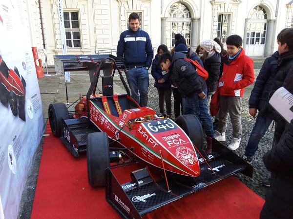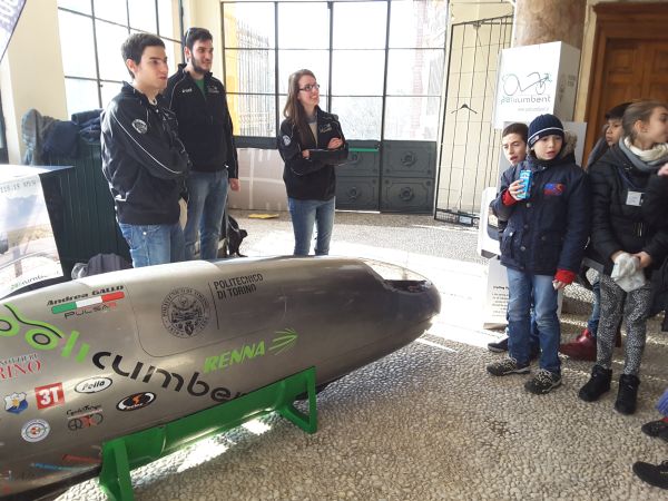 E’ stata realizzata dal team studentesco Policumbent che studia, progetta e realizza veicoli a propulsione umana per affrontare le sfide dei record sportivi e quelle della mobilità di tutti i giorni. Il team Squadra Corse del Politecnico di Torino, nato nel 2004 dall’idea di 10 studenti, progetta e costruisce ogni anno una monoposto da competizione per prendere parte al campionato di Formula SAE, una competizione ingegneristica tra team di studenti universitari. Infine gli allievi hanno ascoltato una breve lezione di architettura con la presentazione del modello in scala del tetto del Castello del Valentino e una piccola introduzione sulla storia dell’architettura della dimora sabauda.