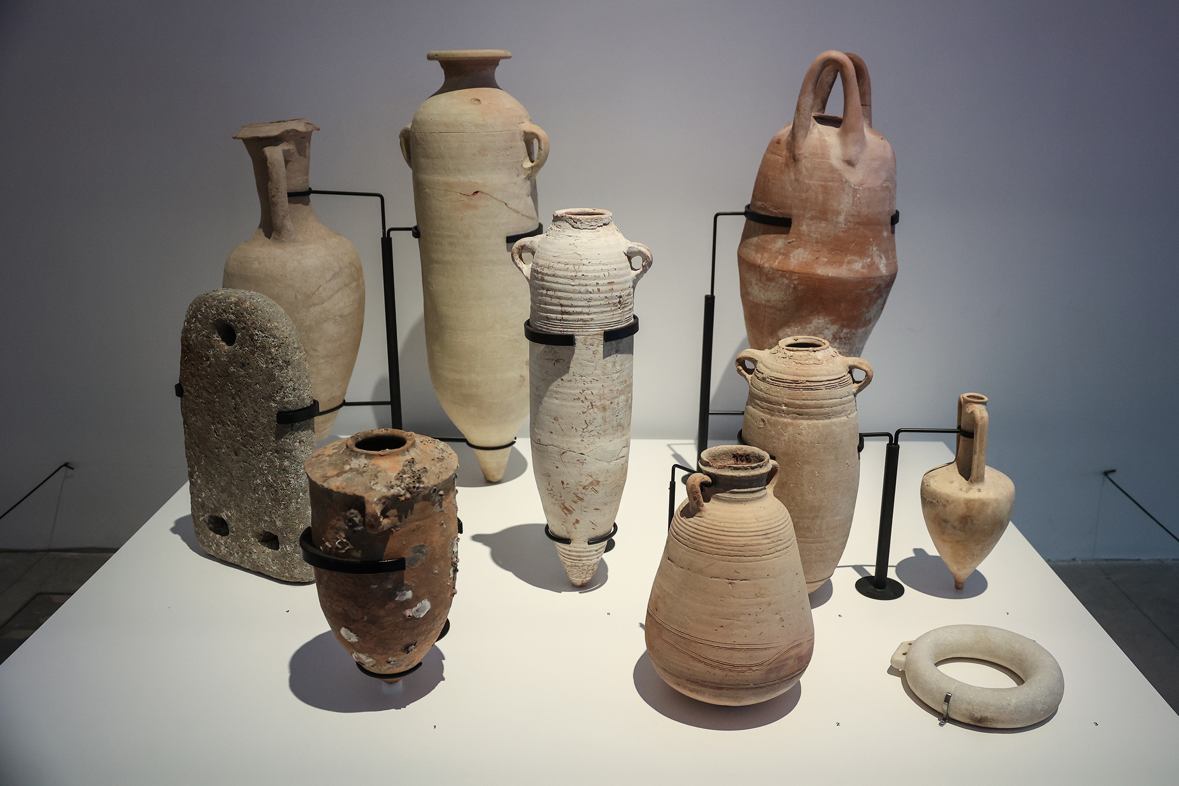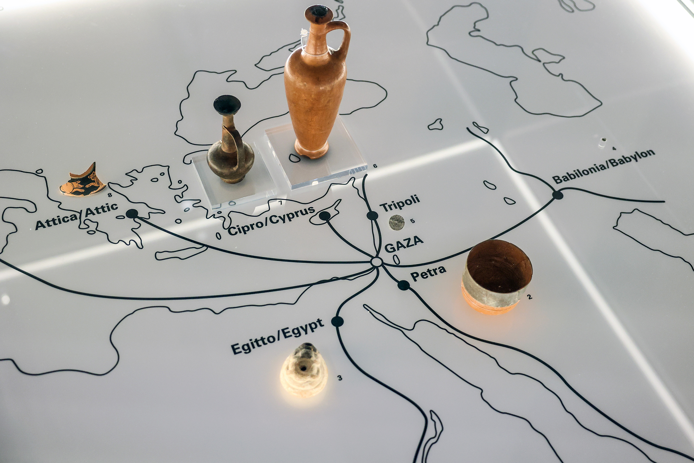 I reperti esposti nella sezione Gaza: ponte tra Europa, Africa e Asia testimoniano il ruolo storico di Gaza come snodo strategico nelle reti commerciali e culturali del Mediterraneo e del Levante: ceramiche – tra cui le anfore destinate al “vino di Gaza” e l’olio d’oliva –, monete – esempio dell’ibridazione culturale del territorio – e manufatti provenienti da Egitto, Grecia, Babilonia e penisola arabica raccontano la continuità degli scambi e delle ibridazioni culturali.