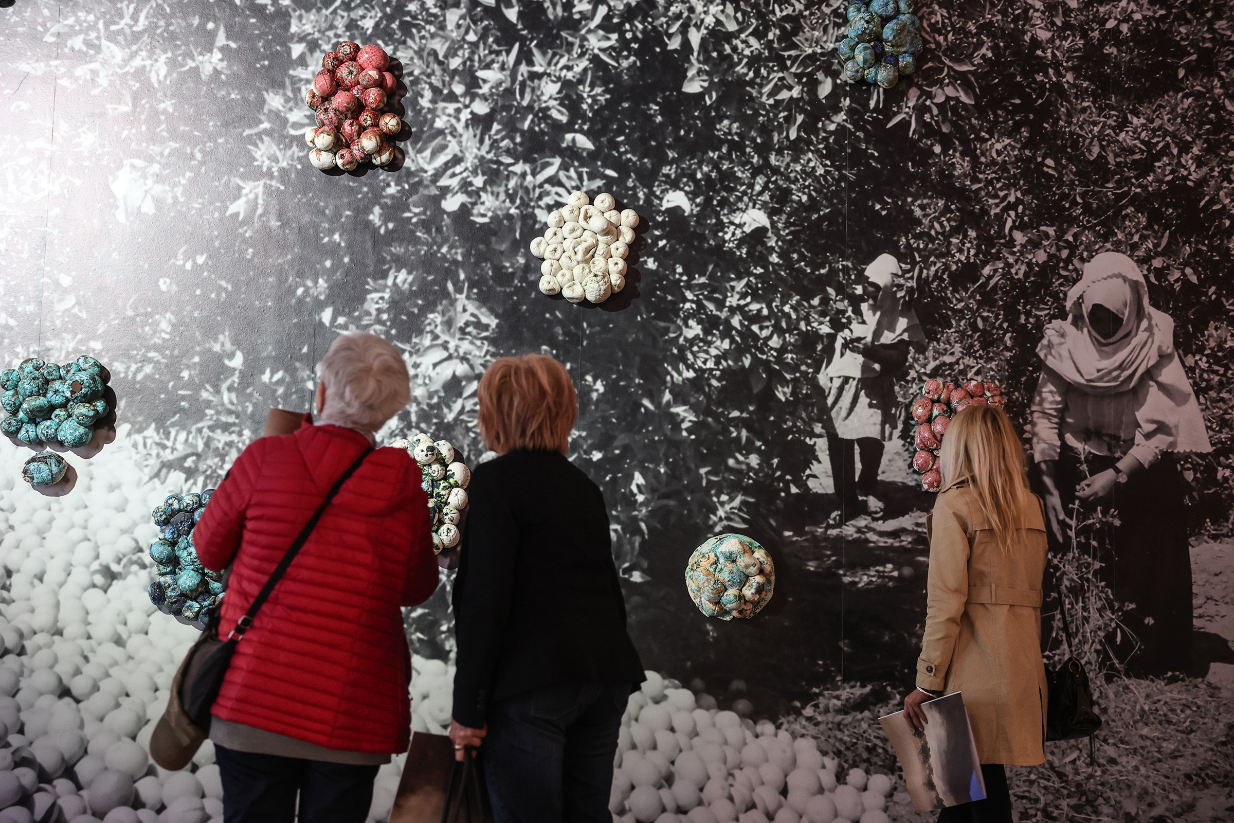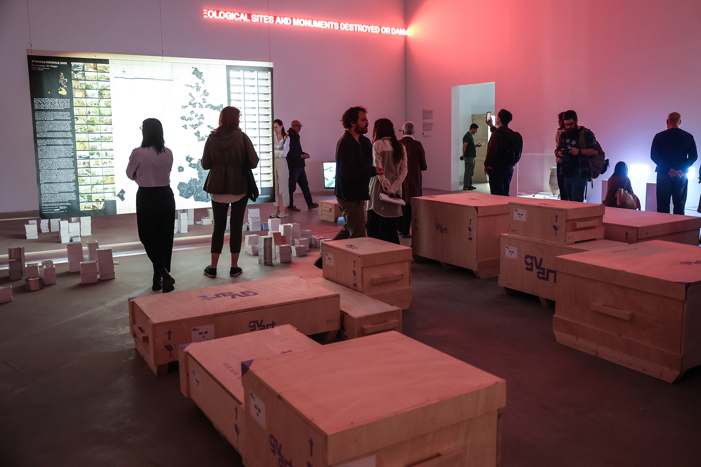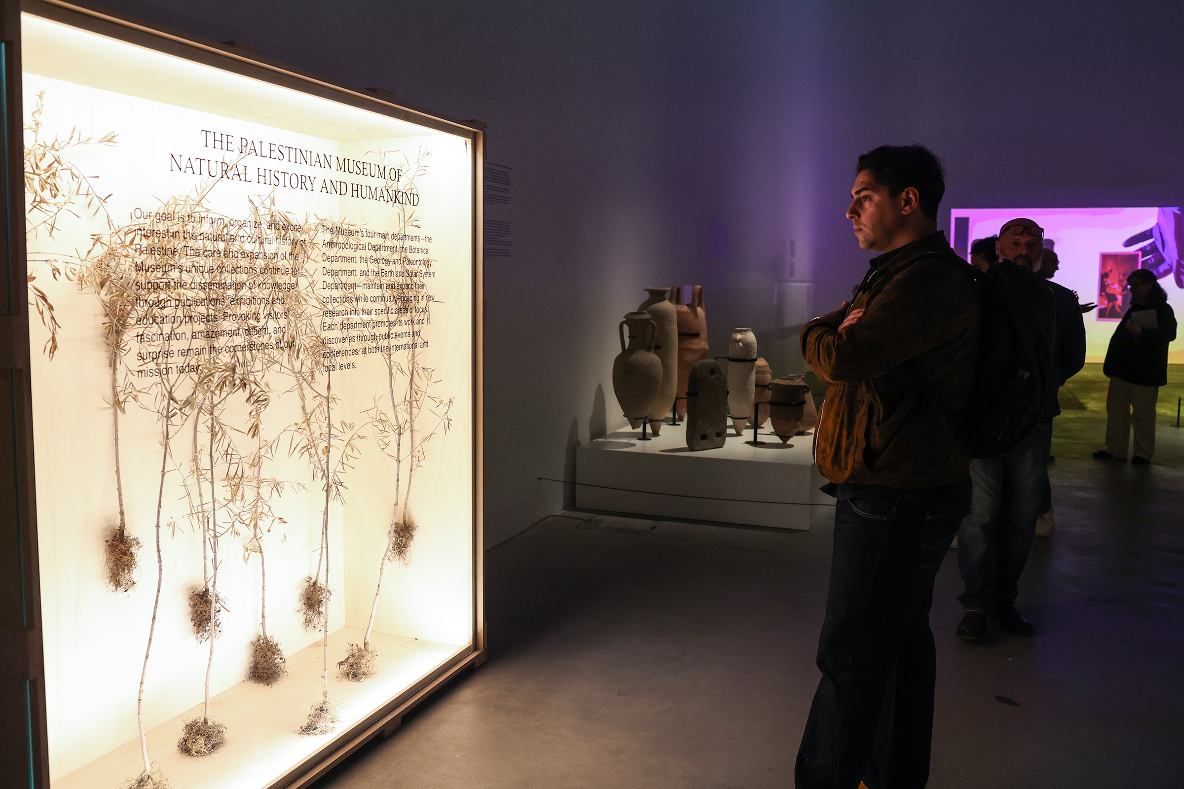 La mostra presenta inoltre opere di artisti contemporanei capaci di attivare un confronto diretto con la storia palestinese, facendone emergere complessità e urgenze nel presente. Gli interventi dialogano con i reperti archeologici, aprendo nuove prospettive interpretative e uno spazio di confronto tra tempi e narrazioni. Tra queste, il neon rosso Act III: Molding (2012), A Geography, Another Geography (2008) e In About the Museum (2004–2011), opere dell’artista Khalil Rabah; il film Cabaret Crusades: The Secrets of Karbala (2015) di Wael Shawky; Reimagining Homeland (2023), e In Genocide Kitchen (2024) di Samaa Emad; Seeds out of Concrete (2025) di Vivien Sansour; Grieving in Colors (2024), Sour Wall (2024), Sour Cities (2024), His/story (2023) e Tayammum II (2023) di Mirna Bamieh; On Photography, Dispossession and Times of Struggle (2017) e An Extraordinary Event (2018) di Akram Zaatari; Sacred Dissonance 1-2-3-6-7 (2025) e Phantom Votives (2025) di Dima Srouji.