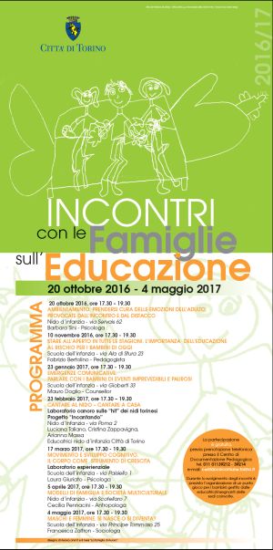 Si concluderà dopodomani, giovedì 4 maggio, il ciclo di approfondimenti sull’educazione, promosso dal servizio “Sistema Educativo integrato 0-6“ dell’assessorato all’Istruzione e all’Edilizia scolastica della Città di Torino . L’iniziativa mira a trovare, insieme ai genitori, risposte adeguate alle piccole e grandi domande sui diversi aspetti della crescita e dello sviluppo dei propri figli.