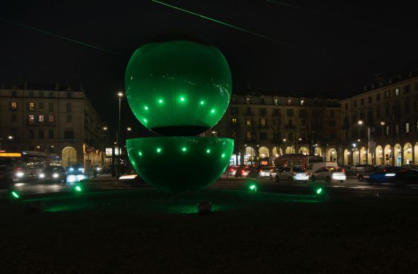 L’opera di Armando Testa, una sfera e una mezza sfera di acciaio nero di circa 5 metri di altezza, sarà illuminata con luci colorate, come a colori è il linguaggio della comunicazione attuale. Saranno luci sempre in movimento, curiose, si faranno vedere da tutti, proprio come insegna da sempre il meccanismo pubblicitario, del quale Armando era profondo conoscitore.