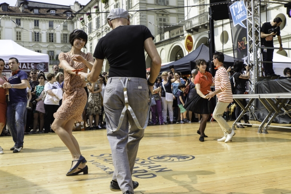 Nell’ ultimo pomeriggio della sezione Fringe di questa edizione del Torino Jazz Festival (giunto ormai al suo quinto giorno) gli undici elementi della Gatsby Orchestra hanno sparso note di jazz e swing nella piazza mentre i ballerini delle scuole di ballo Turincats, Max e Serena, Honky Tonk School e Dusty Jazz hanno dato un saggio della loro bravura.