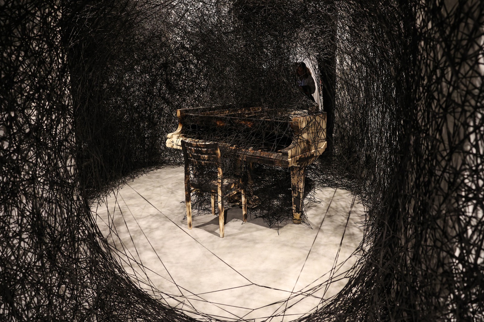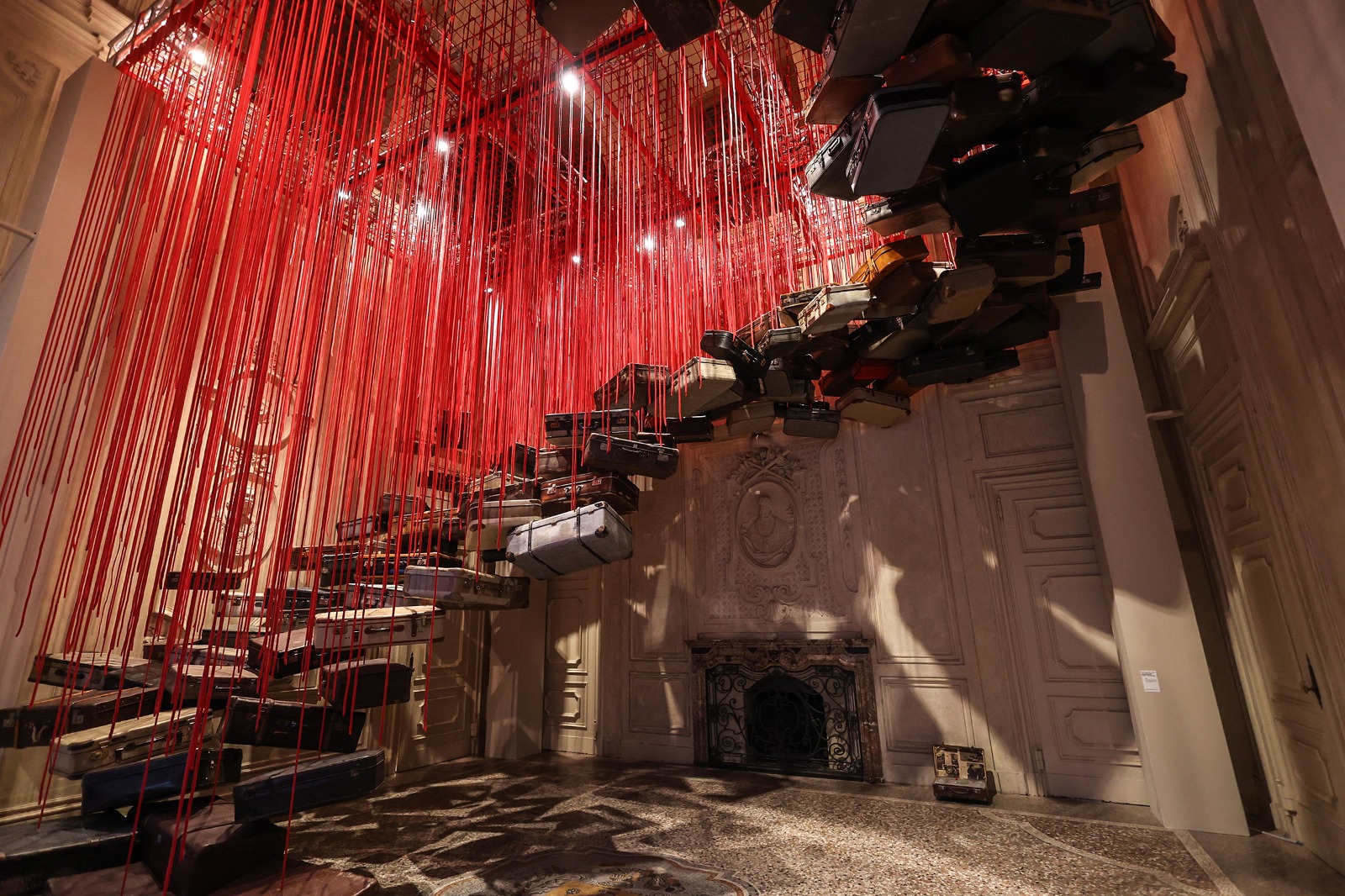Tra le opere in mostra figurano alcune delle installazioni più iconiche di Shiota: Where Are We Going? (2017), in cui il motivo della barca evoca visioni di vite e futuri incerti; Uncertain Journey (2016), con scheletri di imbarcazioni sospesi in un reticolo di fili rossi che suggeriscono i molti incontri che possono emergere alla fine di ogni viaggio; In Silence (2008), dove un pianoforte bruciato e le sedute di un pubblico invisibile, immerse in una rete di fili neri, raccontano il silenzio che segue alla distruzione; Reflection of Space and Time (2018), che riflette sulla presenza e sull’assenza attraverso un abito e la sua immagine specchiata; Inside – Outside (2009), che esplora la soglia tra interno ed esterno, privato e pubblico, Oriente e Occidente; e infine la monumentale Accumulation – Searching for the Destination (2021), composta da centinaia di valigie sospese, simbolo di viaggio, memoria e migrazione.