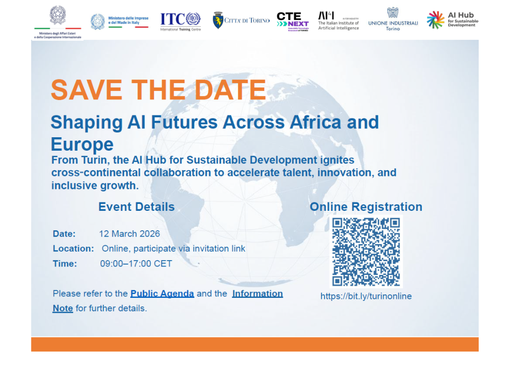 L’iniziativa è realizzata con il contributo del Ministero delle Imprese e del Made in Italy, del Ministero degli Affari Esteri e della Cooperazione Internazionale, dell’AI Hub for Sustainable Development, dell’ITC-ILO, della Città di Torino, di CTE Next, dell’Istituto Italiano per l’Intelligenza Artificiale e dell’Unione Industriali Torino.