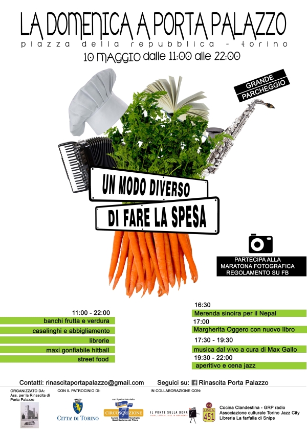 a12Domenica 10 maggio a Porta Palazzo, in piazza della Repubblica, ci sarà il primo appuntamento con “La domenica a Porta Palazzo”. Una giornata di apertura straordinaria del mercato ricca di appuntamenti con banchi del mercato, jazz, street food, danze folk, libri, grandi scrittori e grandi chef, una raccolta fondi per il Nepal e una maratona fotografica.