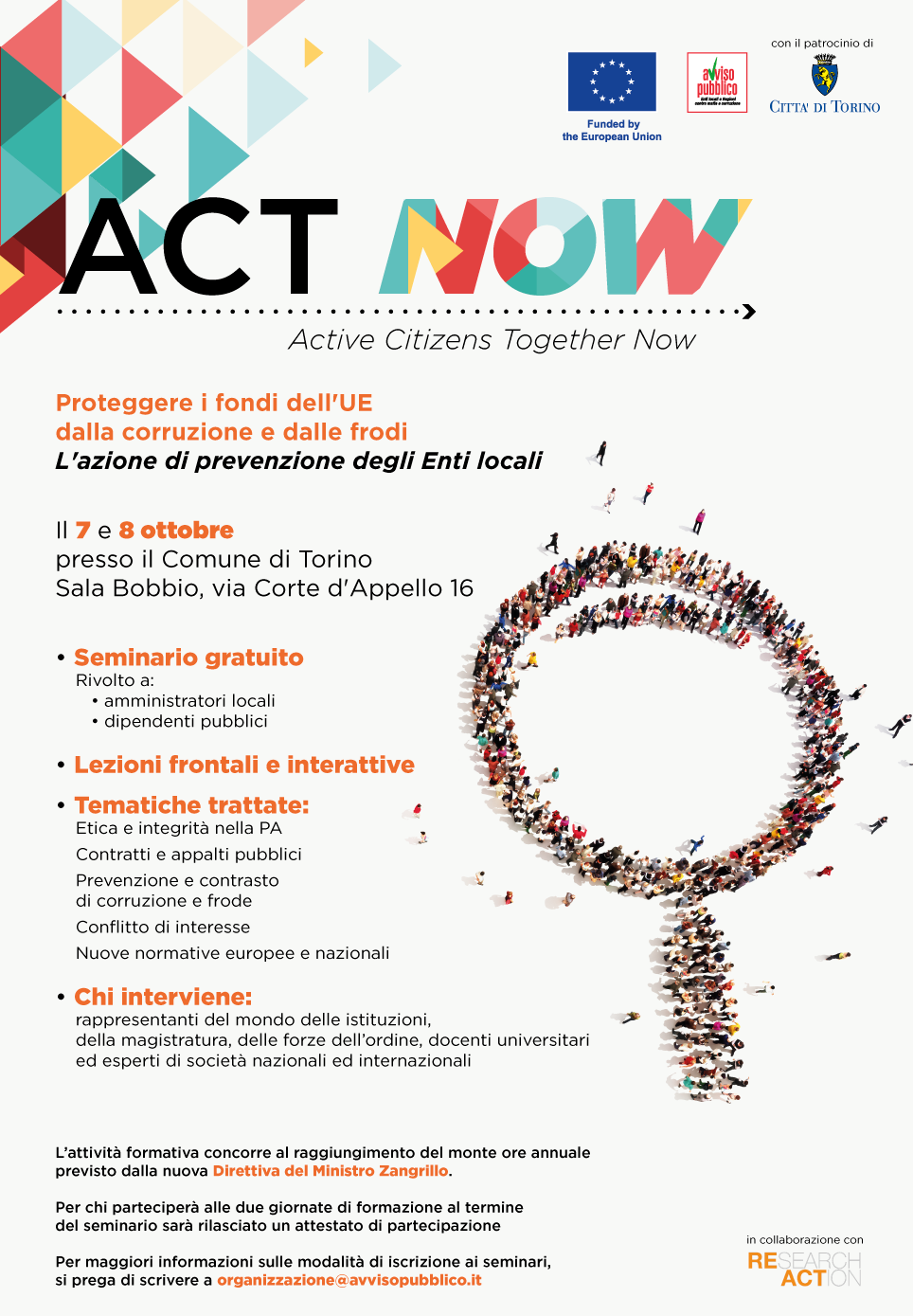 Si svolgeranno a Torino, il 7 e 8 ottobre, le prime due giornate formative del progetto ACT NOW – Active Citizens Together Now, finanziato dall’Unione Europea, in particolare dall’Ufficio europeo per la lotta Antifrode (OLAF), e realizzato da Avviso Pubblico in collaborazione con il centro di ricerca RE-ACT.