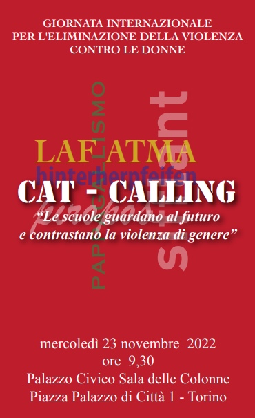 Mercoledì 23 novembre 2022 alle ore 9.30, nella Sala Colonne di Palazzo Civico a Torino, si terrà il convegno ‘Cat-calling – le scuole guardano al futuro e contrastano la violenza di genere’, organizzato dalla Consulta Femminile del Comune di Torino al fine di aprire un confronto a livello cittadino sul tema delle molestie di strada, partendo dal mondo della scuola e coinvolgendo studenti e docenti di alcune scuole del territorio in un percorso partecipato.