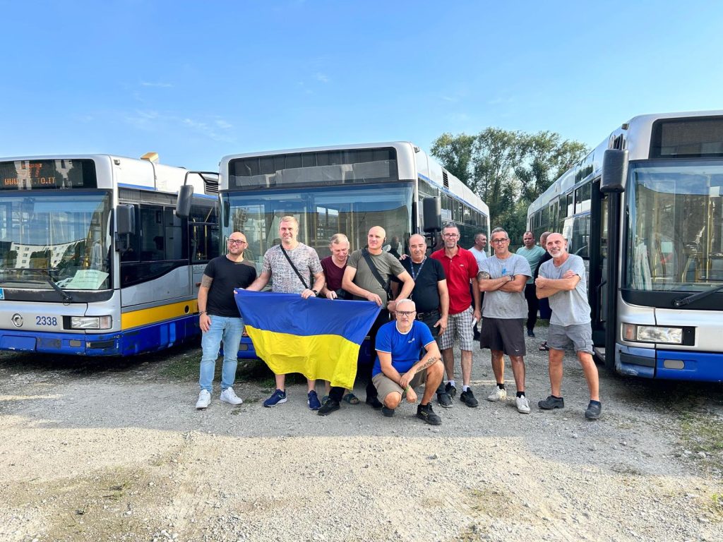 Nella foto i tecnici dell’azienda dei trasporti della città di Kharkiv con i tecnici di Gtt che hanno accompagnato i mezzi fino al confine.