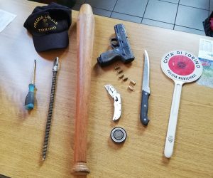 Insospettiti dall’insolito oggetto, gli agenti della Polizia Municipale hanno invitato i due soggetti a scendere e ad allontanarsi dal veicolo per consentire la perquisizione in sicurezza. Sotto il sedile del conducente era nascosta una mazza di legno lunga 70 cm. simile a una mazza da baseball, mentre nel vano porta oggetti del passeggero erano appoggiati 6 bossoli di pistola caricati ‘a salve’ e un cacciavite a taglio. Un coltello a lama lunga di 30 centimetri e un cutter sono stati invece trovati nello stesso vano del lato guidatore dove era appoggiata la barra metallica. Occultata in un cassone dell’autocarro, gli agenti hanno rinvenuto una pistola ad aria compressa priva di tappo rosso sulla volata della canna, dalle fattezze e dimensioni del tutto identiche ad una pistola vera.