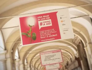 torinoaled_300Sono apparsi in piazza san Carlo i sei stendardi con le cinque frasi scelte dal concorso “Una frase di luce per #TorinoaLed”, realizzato con la collaborazione di Iren e di TorinoSette. Ci resteranno per tutto il mese di marzo. Il concorso è stato realizzato in occasione della Giornata europea del risparmio energetico, sostenuta nel nostro Paese dall’iniziativa “Millumino di meno” promossa da Caterpillar – Rai Radio2.
