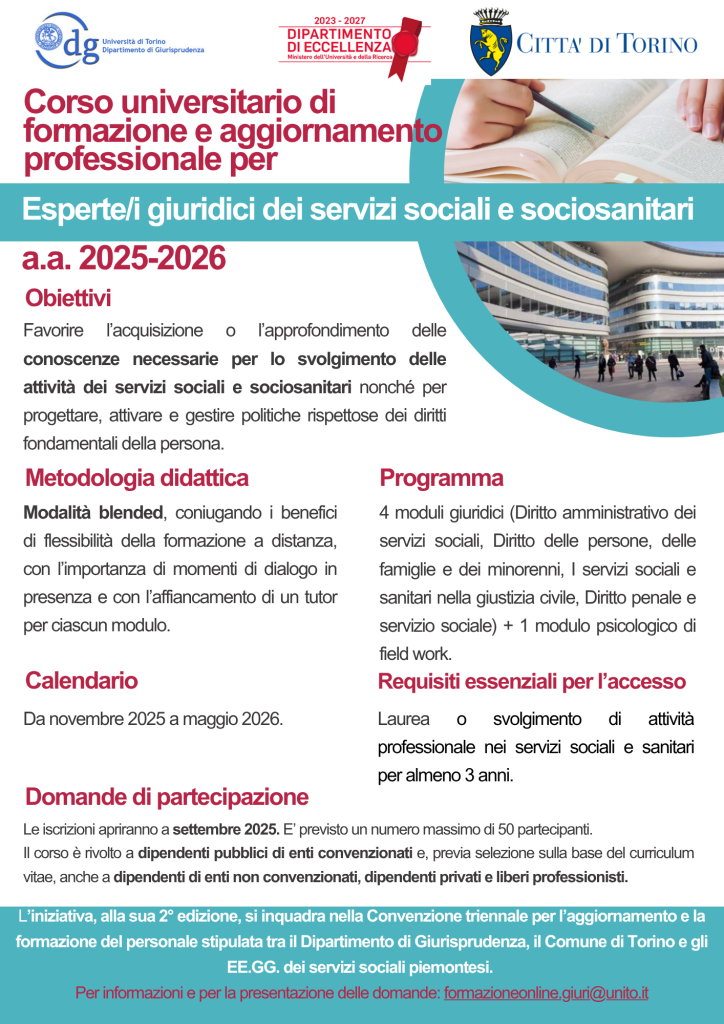 Il 12 settembre, a partire dalle ore 15 nell’aula H1 del Campus Einaudi dell’Università di Torino, si terrà un appuntamento dedicato al mondo dei servizi sociali e sociosanitari, che vedrà la presentazione della seconda edizione del Corso di formazione e aggiornamento professionale per Esperte ed Esperti Giuridici dei Servizi Sanitari e Sociosanitari, nonché la consegna degli attestati ai partecipanti che hanno completato con successo l’edizione 2024-2025.