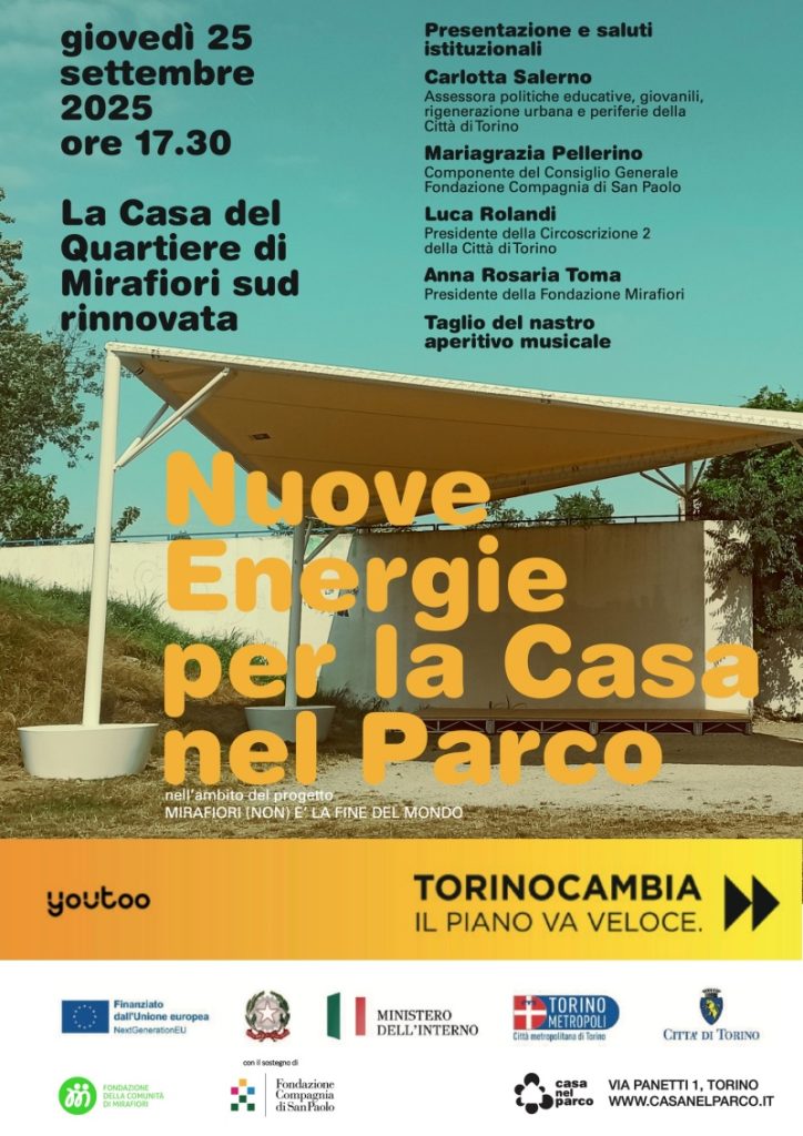 Le opere di riqualificazione della Casa nel Parco sono state realizzate grazie al sostegno di due importanti progetti: “Mirafiori (non) è la fine del mondo”, finanziato dal progetto Youtoo di Città di Torino, nell’ambito del PIU Azione A35, e “Nuove Energie per la Casa nel Parco”, con il contributo della Fondazione Compagnia di San Paolo, nell’ambito dell’iniziativa benEfficientiamo.