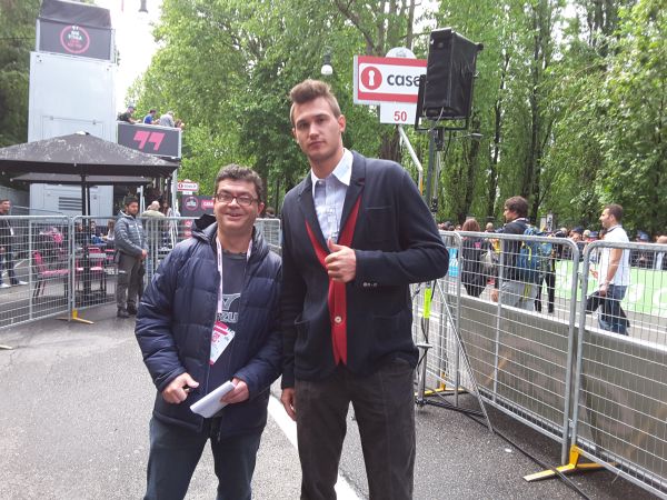 Giacomo Nizzolo (Trek Segafredo) vince l’ultima tappa (poi declassato, la vittoria va a Niklas Arndt. Qui all’arrivo poco prima di essere circondato dai giornalisti. Nibali vince il Giro per la seconda volta!