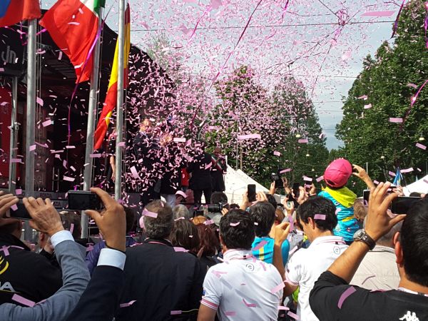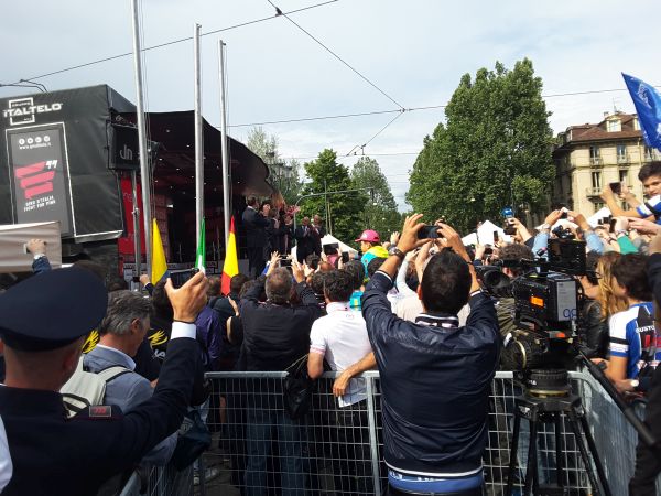 Già verso le 14 una folla vociante lambisce piazza Vittorio in attesa dell’arrivo delle due ruote con negli occhi e nel cuore un Vincenzo Nibali, “lo squalo”, che ieri ha conquistato la “maglia rosa” e si è ipotecato, con il vantaggio superiore al minuto su Chaves, la vittoria del Giro, mentre solo quattro giorni fa, per una defaillance fisica, aveva dichiarato di rimanere per onorare la gara.