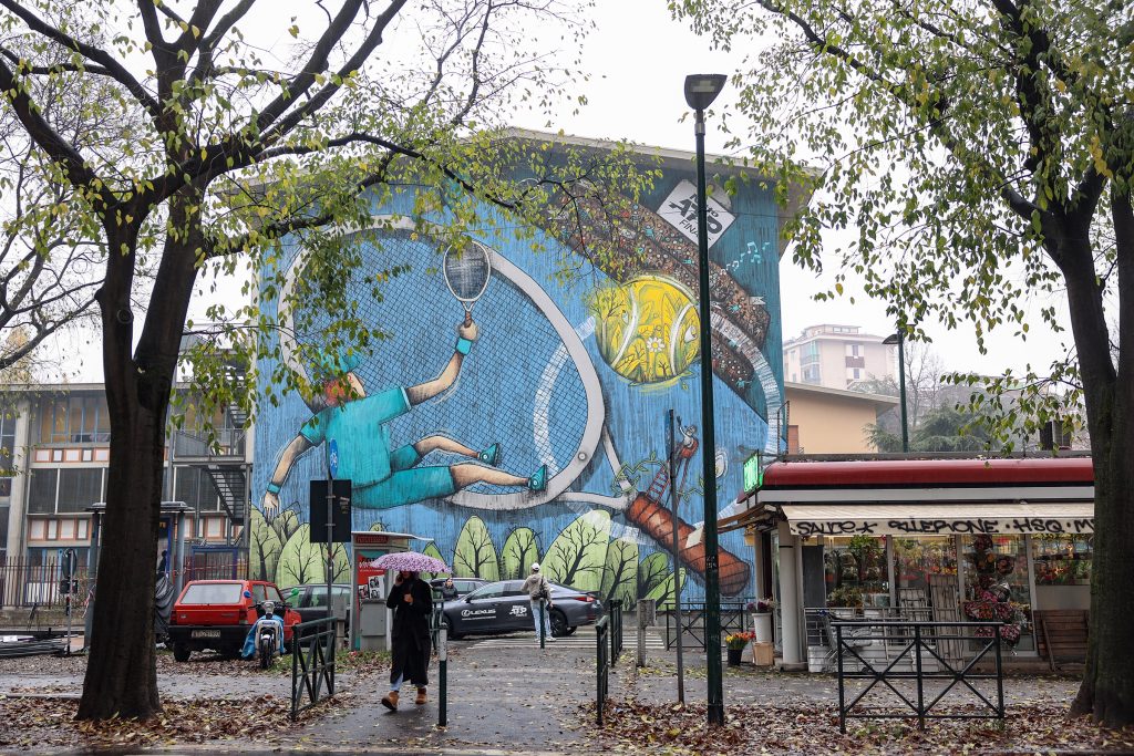 Il murale celebra l’unione tra tennis e sostenibilità ed è stato realizzato con vernici Airlite, una pittura ecologica capace di purificare l’aria dagli inquinanti atmosferici. L’opera include anche alcune note musicali, un omaggio a Leone Sinigaglia, musicista torinese vittima dell’Olocausto, a cui è intitolata la scuola.