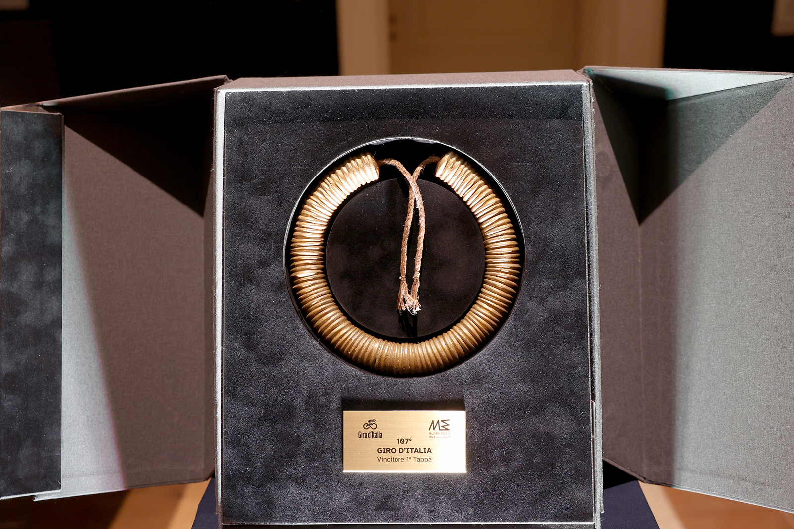 Il Museo Egizio omaggerà il ciclista che per primo indosserà la Maglia Rosa di quest’anno con un oggetto in legno laccato in oro realizzato dall’artista Marco Sciascia. L’oggetto è liberamente ispirato alla collana shebyu, indossata dall’architetto Kha, intorno al 1400 a. C., il cui corredo funerario è conservato all’Egizio.