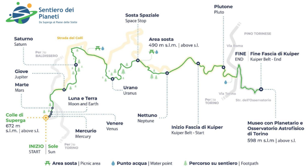 Nel piazzale della Basilica di Superga una sfera di acciaio corten di 1,6 metri di diametro rappresenta il Sole e da lì inizia il sentiero che con un tracciato di circa 8 km permette al viandante di raggiungere il Planetario incontrando, a pochi passi dal Sole, il primo pianeta, Mercurio: una piccola sfera di 0,6 cm di diametro; poi Venere – un po’ più grandicella (1,4 cm) e dopo un centinaio di metri si arriverà alla Terra (una sfera di diametro pari a 1,5 cm); ancora qualche passo e saremo sul pianeta rosso: Marte! A quel punto il viandante dovrà armarsi di un po’ di pazienza e di buon passo, perché i successivi pianeti saranno sempre più distanti tra loro. La fatica però è compensata sia dal poter ammirare sfere decisamente più grandi (Giove con i suoi 16 cm di diametro a quasi un km dal Sole, Saturno con i suoi anelli di 31,4 cm di diametro a 1,6 Km dal Sole, Urano di 5,9 cm di diametro a 3,3 Km dal Sole), ma soprattutto da un contesto naturale di grande pregio.