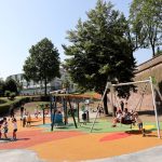 La configurazione movimentata del terreno, ai lati del giardino, è stata valorizzata con l’inserimento di scivoli da pendio, che costituiranno una sicura fonte di attrazione per i bambini. Per garantire la loro sicurezza, nell’area giochi è stata posata una nuova pavimentazione antitrauma.