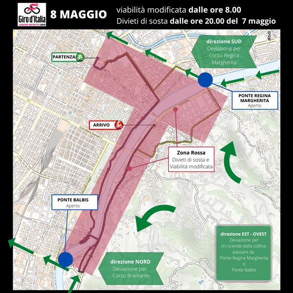 Dalle ore 8.00 dell’8 maggio e fino all’ultimazione della gara, indicativamente intorno alle 20.00, per attraversare la città in direzione SUD provenendo da Corso Casale si dovrà aggirare l’area “Rossa” utilizzando Ponte Regina Margherita e Corso Regina Margherita, mentre in direzione Nord provenendo da Corso Moncalieri si dovrà aggirare l’area utilizzando corso Monterotondo, Ponte Balbis e corso Bramante.