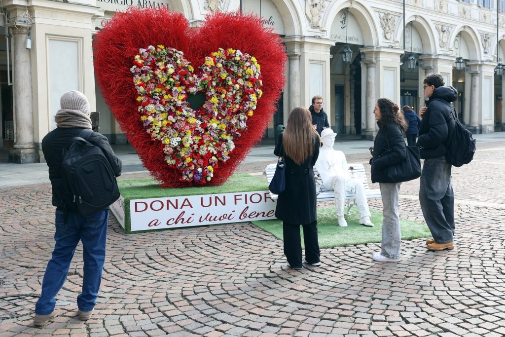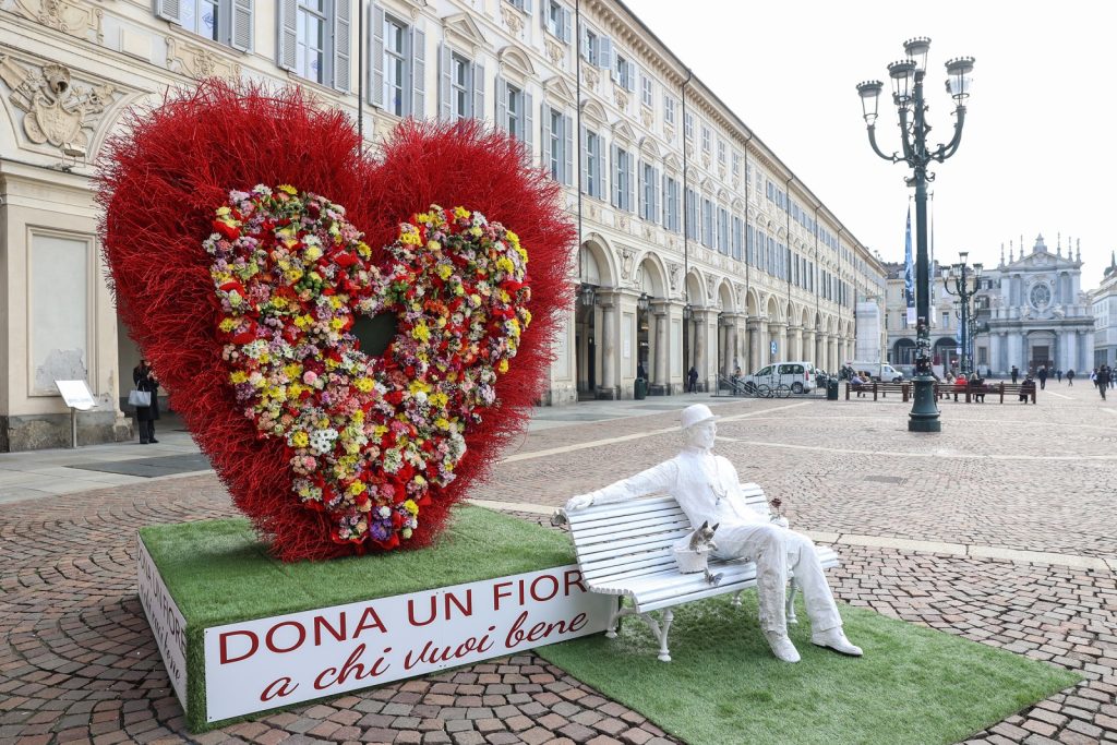 Nel salotto buono di Torino, un cuore alto due metri e mezzo, realizzato da 15 fiorai con 2000 fiori, tutti coltivati in Italia, provenienti da Liguria, Toscana, Campania e Sicilia. All’esterno, una cornice di rametti rossi di betulla; all’interno, un trionfo di garofani, limonium, statice, lilium e sancarlini, in omaggio alla piazza. Accanto, la scultura di un uomo seduto sulla panchina con una rosa tra le mani: un gesto semplice, ma denso di significato. L’opera, firmata, come l’anno scorso, dal giardiniere-artista Rodolfo Marasciuolo, – racconta l’attesa dell’amore, un sentimento universale, senza età, che appartiene a tutti.