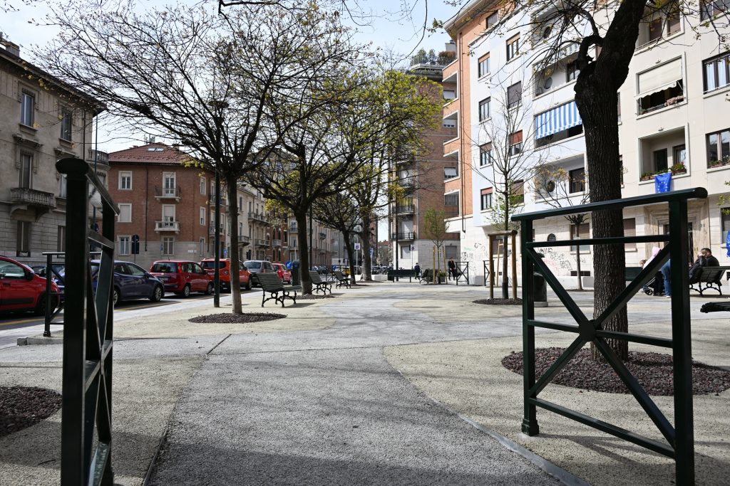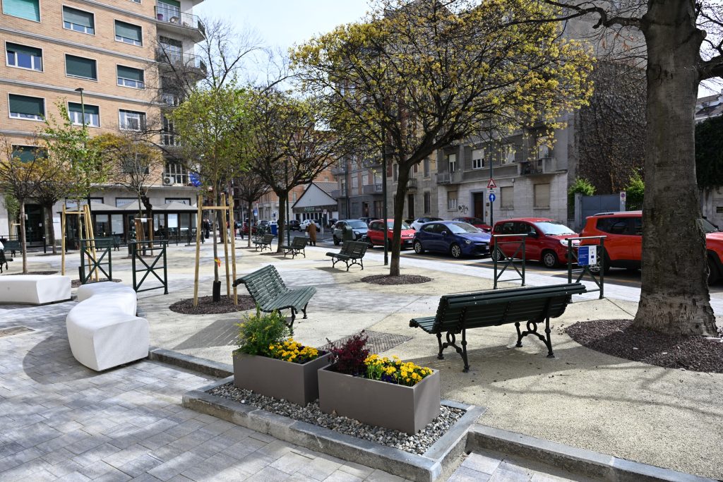 La zona verde è stata ampliata e riqualificata con nuove pavimentazioni drenanti, arricchita da nuove alberature, tra cui un Acero di Freeman (Autumn Blaze) e due esemplari di Parrotia persica, e dotata di nuovi arredi urbani: fioriere, panchine in legno e calcestruzzo, spazi per eventi e un toret.