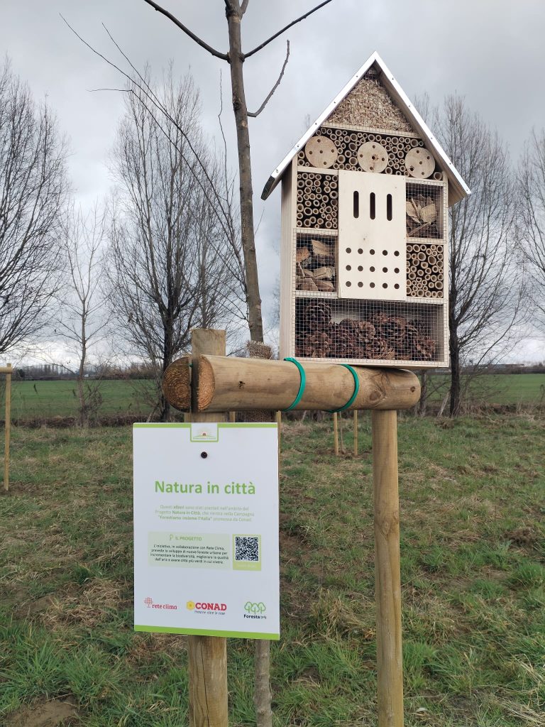 Con l’aiuto dei bambini di una classe della limitrofa scuola Da Vinci, che sotto la guida degli esperti di Rete Clima hanno liberato un centinaio di coccinelle, nell’area è stato installato anche un “Bug Hotel”, una struttura in legno progettata per ospitare e favorire la colonizzazione di insetti, sia impollinatori, che non, come coccinelle, crisope, sirfidi, ditteri, lepidotteri, api solitarie, vespe muratrici ecc.