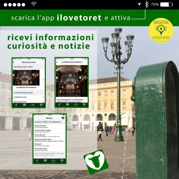 E’ una applicazione – APP – promossa dall’associazione I love Toret e Smat, che utilizza i toret presenti in tutta la città come un nuovo canale di comunicazione, trasformando ogni fontana in un “hot spot” per veicolare, in forma gratuita e non invasiva, contenuti geolocalizzati e personalizzati: dalla storia del quartiere a quella dei monumenti più significativi della zona; dai dati sulla qualità dell’acqua emessa dalla fontanella a iniziative di carattere culturale presenti nel circondario. che hanno messo insieme il passato con il futuro.