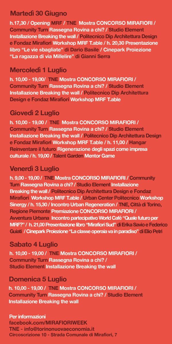 Dal 30 giugno al 5 luglio i suoi 60mila metri quadri sono completamente a disposizione dei cittadini, con eventi, discussioni aperte, percorsi partecipati, mostre, cinema workshop e installazioni. Un panorama ricco di spunti per ridare vita a un luogo storico dell’industria italiana. Mirafiori Week, questo il nome dell’evento, mostrerà ai visitatori le idee di riutilizzo pervenute attraverso il concorso, con un corredo di eventi associati al tema della rigenerazione urbana e dello sconfinamento, filo conduttore di Architettura in Città. Il 3 luglio alle 15,30 ci sarà la premiazione delle idee migliori, presente il sindaco Piero Fassino.