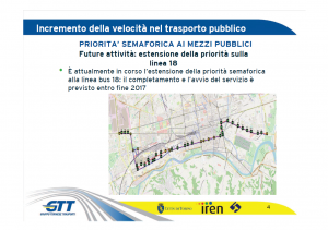 Un gruppo di lavoro composto da tecnici del Comune di Torino, GTT, 5T e Iren sta lavorando per migliorare la velocità commerciale di tram e bus. Alcuni di questi interventi sono già in fase di attuazione, in particolare la priorità semaforica per il mezzo pubblico. Al momento questo intervento riguarda le linee tranviarie 15 e 16 e ha già portato a risultati positivi: la linea tram 16 ha migliorato la velocità di circa il 14% con una riduzione media dei tempi di percorrenza di 4 minuti, la linea 15 ha migliorato la velocità del 10% con una riduzione media dei tempi di percorrenza di 5 minuti. La priorità semaforica sarà estesa alla linea 13 e anche alle linee autobus, a partire dalla linea 18. Si interverrà poi anche sulle corsie riservate ai mezzi pubblici. L’aumento della velocità di tram ed autobus consente, a seconda dei casi, di aumentare la frequenza dei passaggi o di mantenere la stessa frequenza con un risparmio di mezzi.