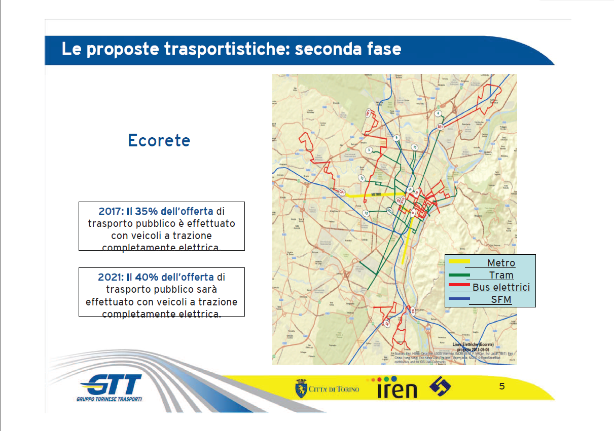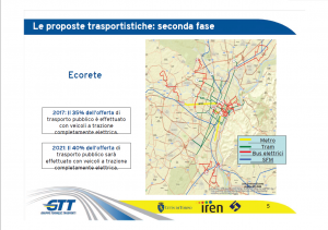 In relazione agli interventi sul servizio di metropolitana e tram, il piano prevede il progetto di una nuova rete di superficie, afferente alle aree di influenza della metropolitana e dei servizi tranviari ed alle stazioni del servizio ferroviario metropolitano. Oltre a una revisione e ottimizzazione complessiva della rete di trasporto da attuarsi a partire dal secondo semestre 2019. Inoltre, negli anni 2017-2018, ci sarà un aumento della flotta di veicoli a trazione elettrica e relativa produzione chilometrica. Nel 2021 il 40% dell’offerta di trasporto sarà effettuato con veicoli a trazione completamente elettrica. Già oggi, dopo l’acquisto dei nuovi bus elettrici l’ecorete Gtt (tram, linee star e bus elettrici), copre il 35% dell’offerta complessiva.
