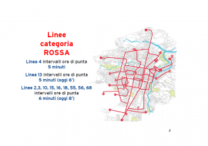 Si è deciso di investire sulle linee di forza (categoria Rossa) che trasportano il 50% dei passeggeri complessivi con una copertura di tutte le zone della Città. Nello specifico, per gli intervalli nelle ore di punto si procederà in questo modo: la linea 4 intervalli di passaggio 5 minuti come la linea 13 (oggi 6 minuti), le linee 2, 3, 10, 15, 16, 18, 55, 56, 68 (che oggi hanno intervalli di 8 minuti).